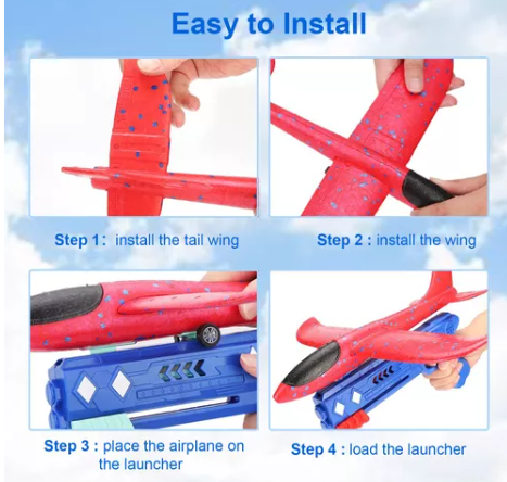 Fácil de ensamblar y listo para jugar Este avión planeador está listo para jugar con una fácil instalación. Durante el montaje, los niños pueden ejercitar su habilidad práctica para hacer sus propios aviones. Ejercitando sus habilidades motoras y el sentido de la dirección y el equilibrio, cuando están volando el avión de juguete para niños y niñas de 4 años en adelante.
