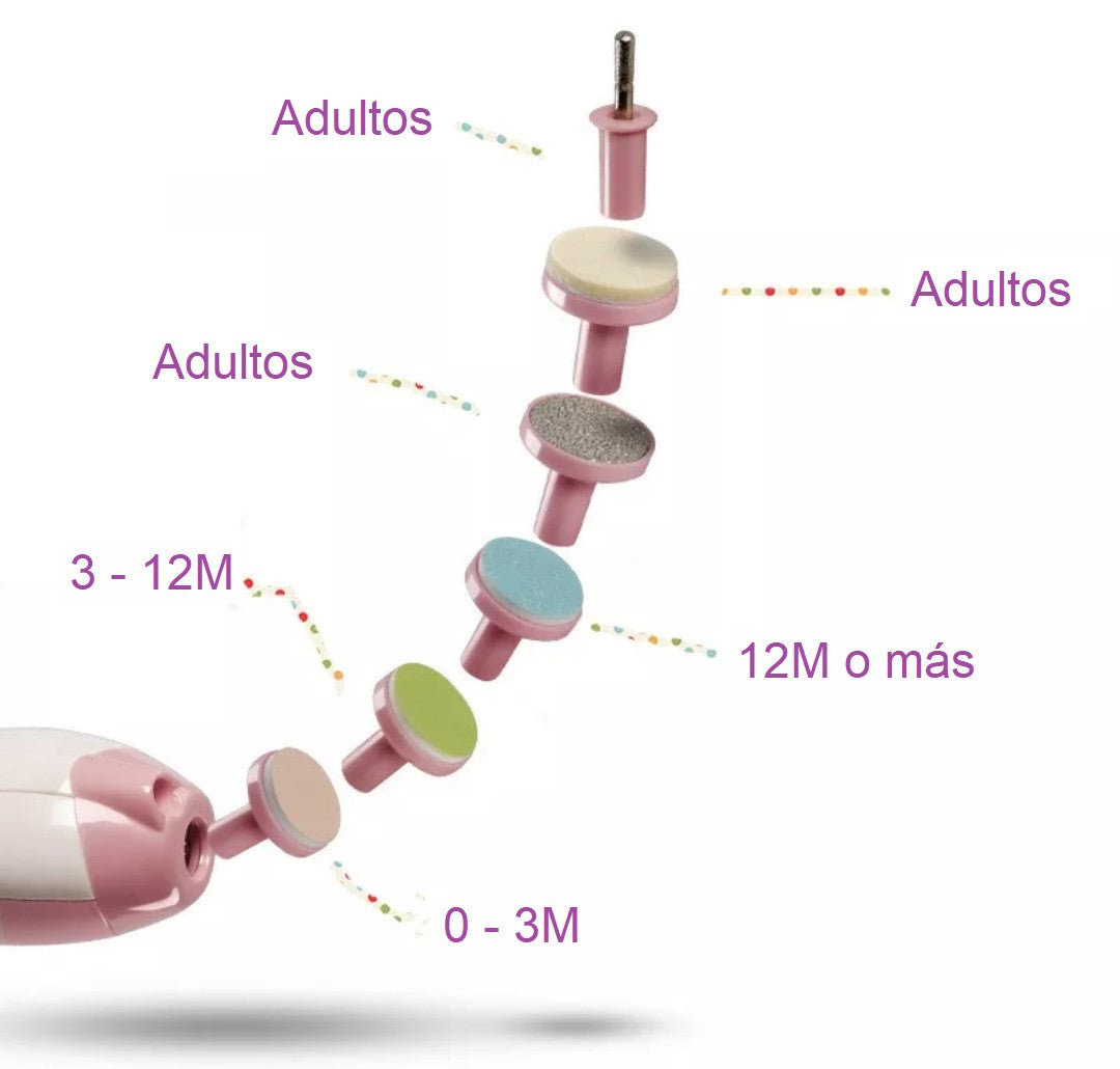 Lima Eléctrica para bebé con diferentes cabezales según la edad en meses del bebé, al igual que 4 tipos de velocidad.