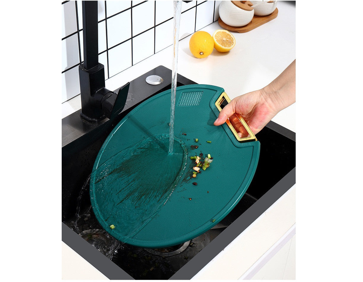 Diseñada con un mango giratorio, esta tabla de cortar es fácil de agarrar. Haga que la tabla de cortar se pueda colgar y se levante sin ocupar espacio. Sin filtraciones de agua y sin absorción de agua.